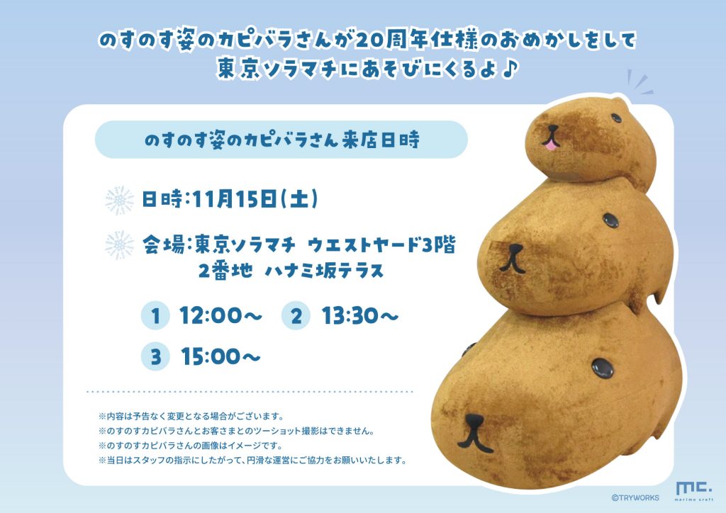 20周年のおめかしをしたカピバラさんが東京ソラマチに遊びに来てくれます!